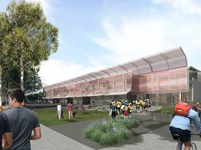 A “vibrant and welcoming” facility will be created through a sculptuiral front and a deck created with rainbow battens.