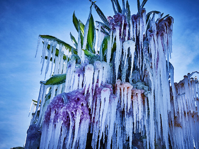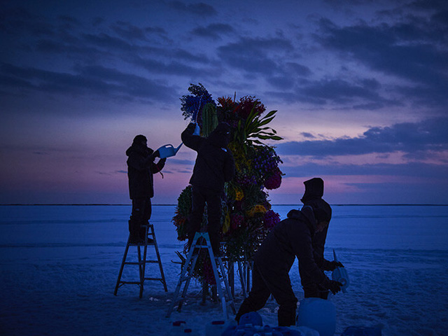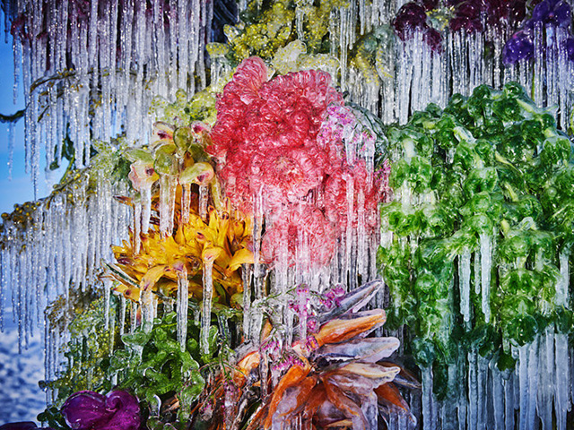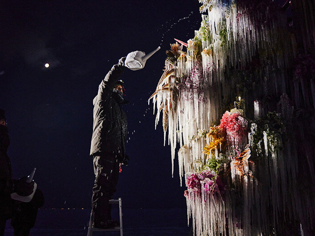 In Hokkaido, Japan the temperature can drop to -15 degrees, creating the perfect environment for Makoto’s frozen flowers. Makoto aims to study the changing life of flowers and how they change and evolve in extreme conditions. To do so, Makoto covers the flower installation in water that quickly freezes into ice. The result is a colourful towering bouquet encased in a coat of dripping ice.
