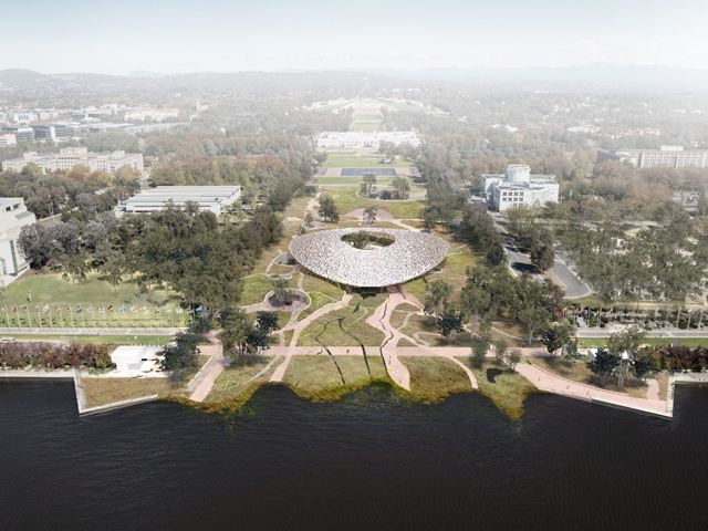 Welcoming all visitors, the design concept for the National Indigenous Knowledge and Cultural Centre incorporates a large, organic and embracing canopy, gently held aloft over a central plaza, framing and bowing towards Bulajima, Mount Ainslie, marking the presence and arrival to the precinct.