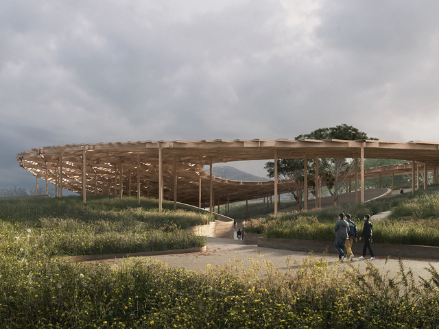 The largest of the spaces, it will function as a central plaza hosting a new community room for events and functions. Beside the courtyard, the indoor cultural centre will be nestled into the hilly landscape – with visualisations depicting the structure wrapped by textured walls and glass openings, and topped with greenery.