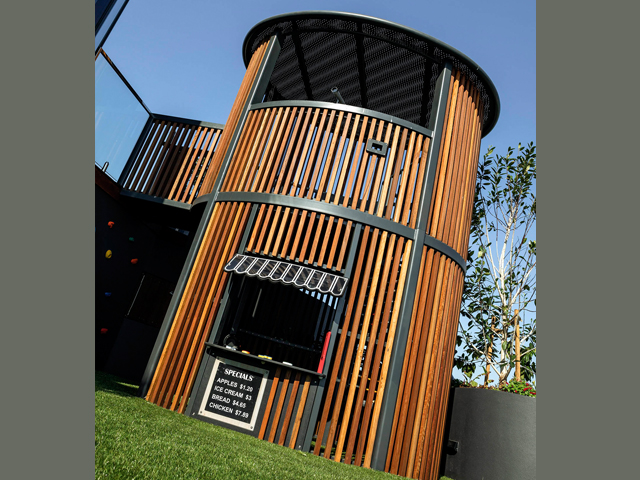 Featuring a tunnel slide, shop front, two level access, internal climber, telescope and an access bridge, the playspace was made from mild steel and clad in dressed and oiled spotted gum. Other unique materials, such as printed polycarbonate, were used for added detail. Setting a new standard for urban living, Rhinoplay proves that play value doesn’t have to be sacrificed for aesthetics.