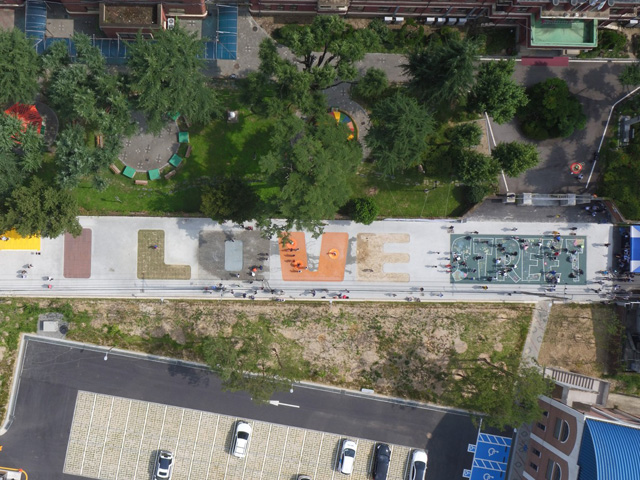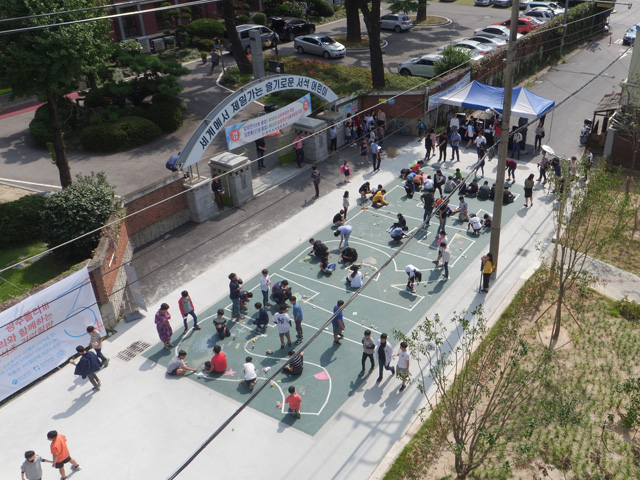 Working with Gongjeong Construction Co, the 960-square-meter street surface was covered with different materials and elements allowing for a maximum number of uses, including sitting, painting, jumping, climbing and playing. The surfaces were kept mainly flat, allowing the space to remain adaptable for larger events. As a symbolic representation of the community’s closeness and celebration of public space, the different pavements were arranged to spell out the word LOVE.