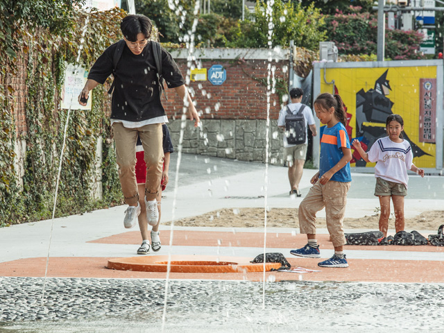 Aimed at exploring how architecture contributes to urban regeneration through both decorative and functional means, the I LOVE STREET installation was developed through a participatory process that asked students from Seosuk Elementary School to contribute drawings expressing their desires for the street. The end result was a graphic, sensory-stimulating design featuring zones in a multitude of materials including grass, fountains, sand, wood, a trampoline and a giant chalkboard.