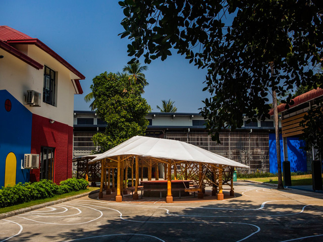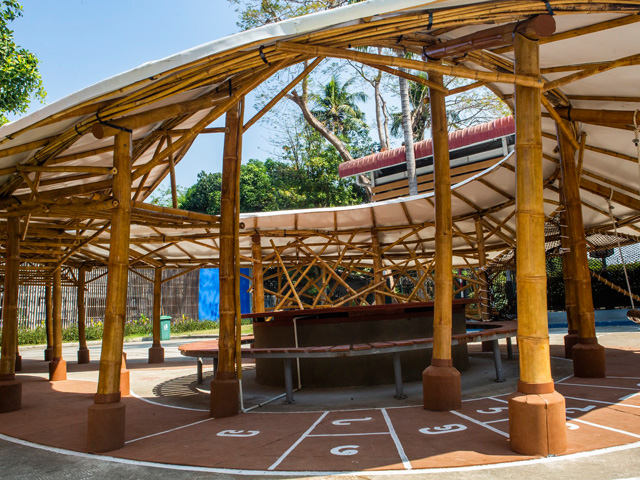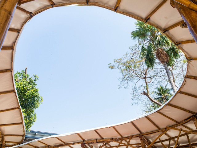 The entire structure is made from bamboo, three different species were used, Dendrocalamus giganteus for the frames, bundles of Oxytenanthera albocialiata Munro for the curved elements, and Thyrsostachys siamensis for the bracing and roof beams. Within both openings of the shape, there are existing trees and seating spaces for the teachers to rest and check on the kids at the same time.