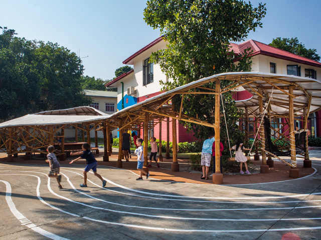 FROM THE ARCHITECTS: The playground originally consisted of a big concrete floor with no shading and no games. The design weaves itself around the two existing trees on the site into an infinity-shaped structure. Within the structure, we articulated a series of games, which, combined, creates an infinitely long obstacle course. The games go in the following order: bamboo jungle; fishing net; monkey bars; swings; Myanmar-style hopscotch and repeat itself.