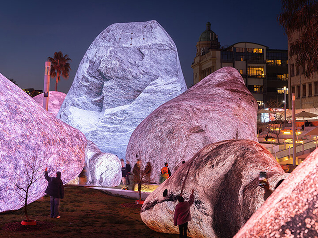 Melbourne-based art and technology studio ENESS has installed Iwagumi Air Scape, a large inflatable rock garden, in Prahran Square for its Australian premiere. The inflatables contrast the urban setting, appearing as realistic rock formations in the day and turning into a vibrant lighting display once the sun sets.