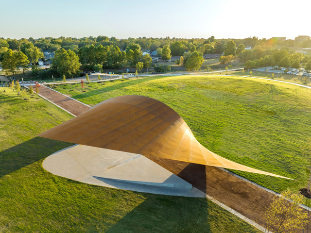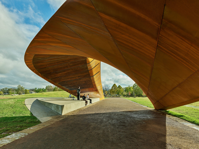New Orleans architecture studio Trahan Architects has completed a performance pavilion made of weathering steel that is anchored by two ground points, making the structure appear lighter than it is.