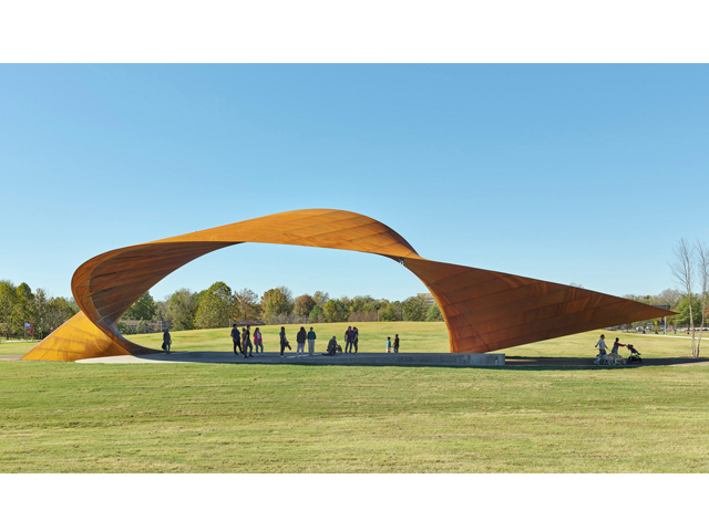 Located in Springdale, Arkansas, this hand-bent steel pavilion looks lighter than air, and is providing the community both shade and sculpture!