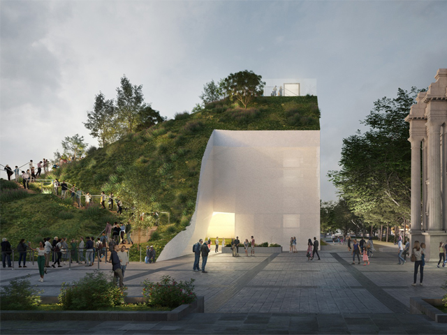 The design for MVRDV’s Marble Arch Hill has been unveiled, revealing a hollowed-out mountain that will provide visitors with rare views over London’s Hyde Park. Based on scaffolding structure, the design aims to create renewed interest in the area as London works to emerge from the pandemic.