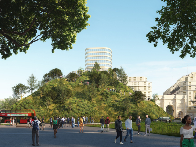 Designed to redefine the connection between Oxford Street and Hyde Park, Marble Arch Hill connects to one of Europe’s busiest shopping streets. According to MVRDV, the design will introduce a “park-like landscape of grass and trees, and lifts this corner of Hyde Park to create a 25-metre-tall viewpoint that gives visitors an overview of Oxford Street and the park." The project is made to be experienced via a single continuous route so visitors have multiple views on the arch.