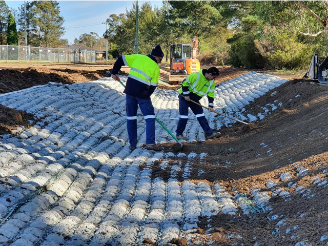The permeable concrete mat controls erosion, sediment is filtered at drains lined with concrete mats at community sports fields in Moss Vale NSW.