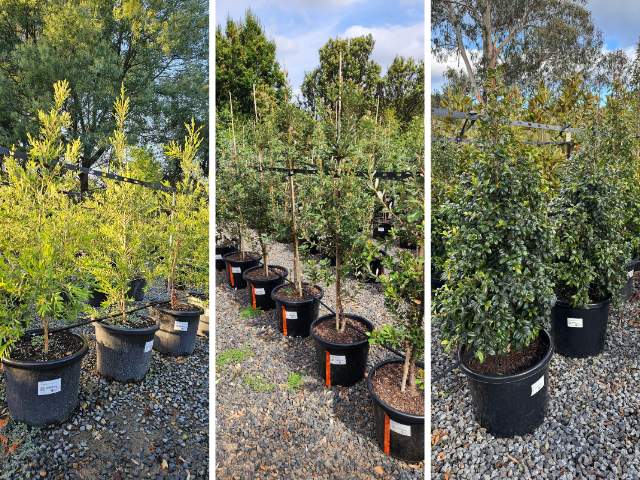 Waterhousea floribunda ‘Whisper’. This tree is unique to Speciality Trees and is its best-selling tree. It is a versatile and bushy Lilly Pilly growing 8m tall x 5m wide with an elegant almost graceful weeping habit, perfect for large screening projects and the softening of buildings and fence lines. Unlike other Waterhousea, this one is propagated from Victorian mother-stock, so responds better to all weather conditions, including cooler climates.