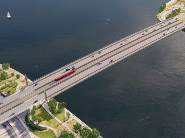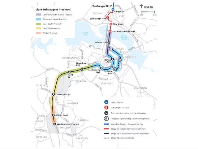 The plans include a new bridge between the existing Commonwealth Avenue bridges that will carry the light rail over Lake Burley Griffin. New stations are expected to be built at Woden Public Transport Interchange, Phillip Oval, Carruthers Street, Kent Street, Hopetoun Circuit, Melbourne Avenue and Sydney Avenue.