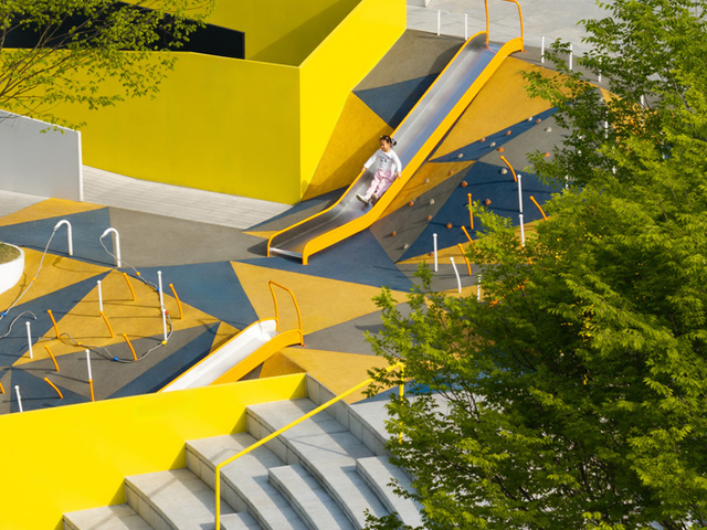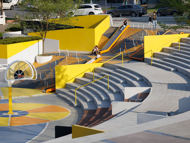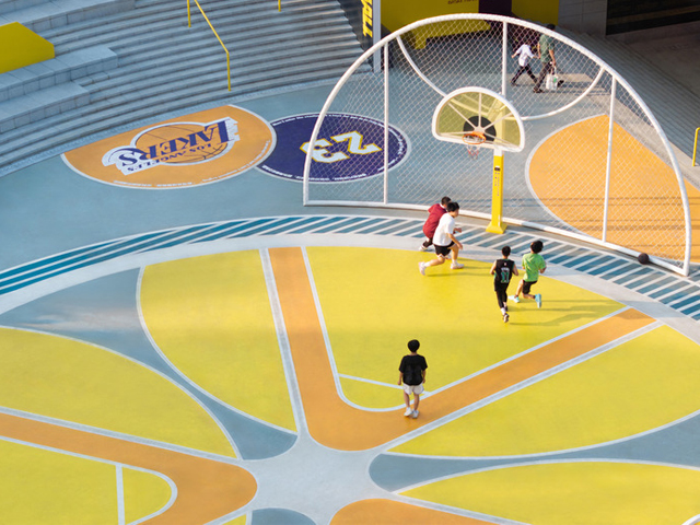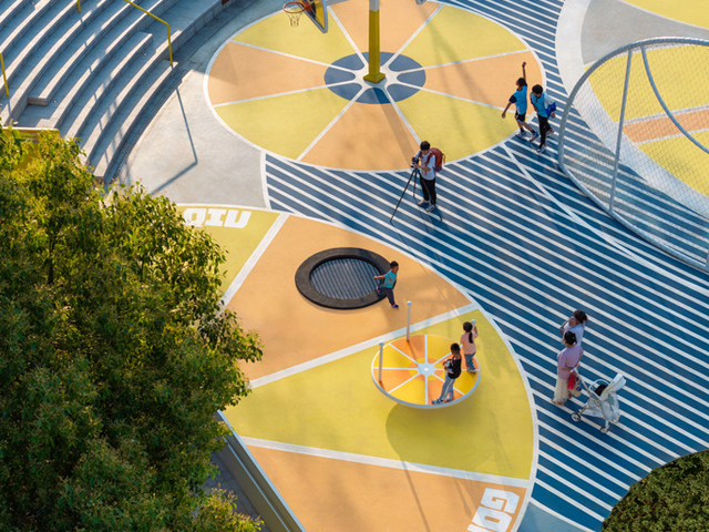 An under-utilised underpass in China has been transformed into a colourful, basketball-focused community space, with bright neon colours and a citrus motif creating a playful contrast to the grey of the surrounding motorway.