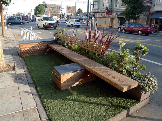 "Because car spaces are essentially temporary storage modules, you can simply plug in a public space… which will benefit more people than the single car space," he says. “In this way you could say parklets return public space to the public.”