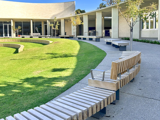 As part of the school’s ongoing redevelopment, Aspect Studios has reimagined several outdoor areas to encourage interaction, creativity and connection with nature. The design team chose to integrate semi-custom natural-style benches to define spaces and invite students to gather and unwind outdoors. These seating elements not only enhance the visual appeal of the campus but also foster a sense of calm and belonging, essential qualities for any modern educational environment.