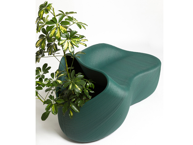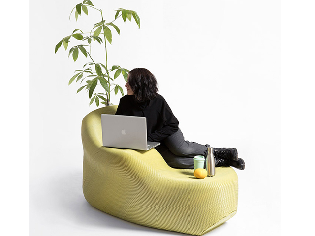The furniture is made primarily from PP and PE plastics commonly used in food packaging, which is sourced directly from the plastic waste donated to the lab. The waste is sorted, washed and shredded before being melted and combined with pigments to create a printable material. The furniture can also be made from PET and PS plastics.