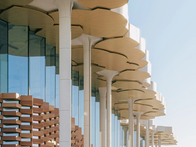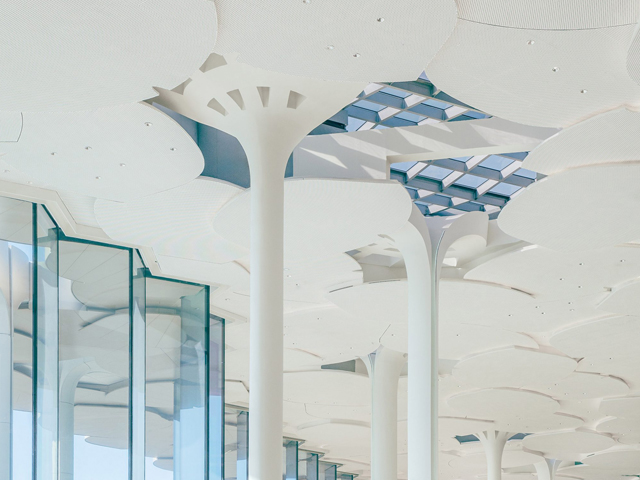 Supporting the roof are tall, slender columns that split into flat panels at their peak. These are modelled on the leaves of a ginkgo tree – a 290-million-year-old species that is native to China – to form a ceiling that resembles a canopy. The columns have a modular design, developed to reduce material waste and integrate technologies such as lighting, acoustics, and rainwater collection. Outside, real ginkgo trees have been planted at the entry points, framed by the glass walls to further enhance the connection with nature.