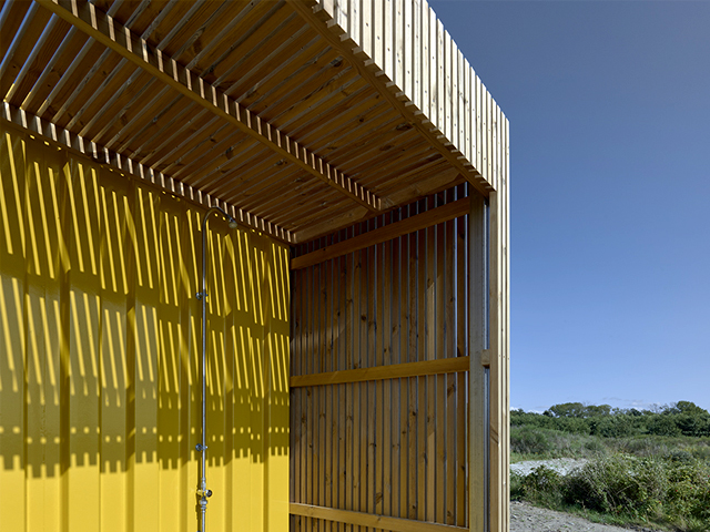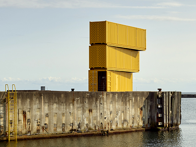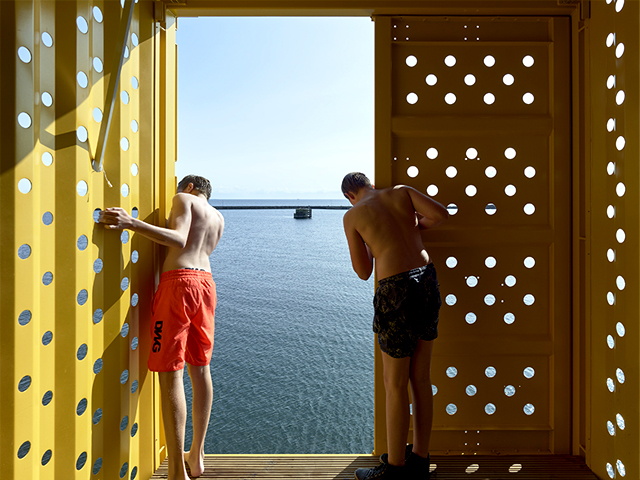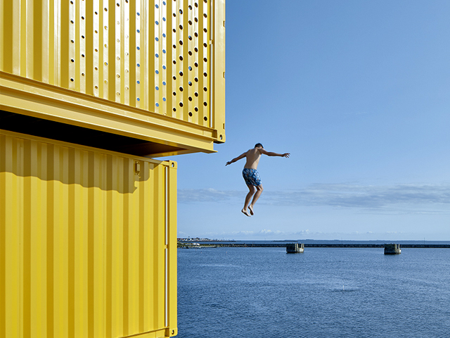 Danish-based firm Sweco Architects’ diving tower is the region’s visible marker. The tower is designed for a jump from 4, 8 and 11 metres and has a distinctive yellow signal colour that can be seen from the great belt bridge. The structure is made of three stacked containers that turn gradually to generate an interesting interaction between activity, shadows and volumes.