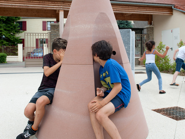 Similarly, the Pink Cockpit features a large, cone-shaped body with three recessed, arch-shaped seats that are connected by four holes for children to peer through and communicate. It is made of sandstone from the Vosges region in France.