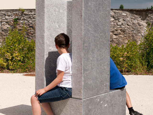 The first structure is the Ventriloquist's Throne that consists of a double seat divided by a tall, cocooning structure with elevated sides. Made of volcanic stone from the Auvergne region in France, the tall backrest has a five centimetre, circular hole.