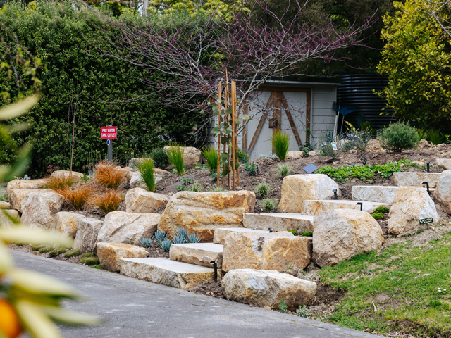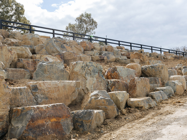 Coldstream landscaping brings a rich multi-coloured palette of blues, purples, greys, browns and golds, available in large feature blocks (300 mm–2000 mm+) as well as a variety of spalls, walling and crushed material. Its naturally angular faces make each block unique, making it excellent at creating depth in a landscape.