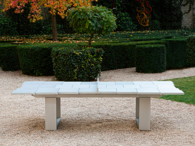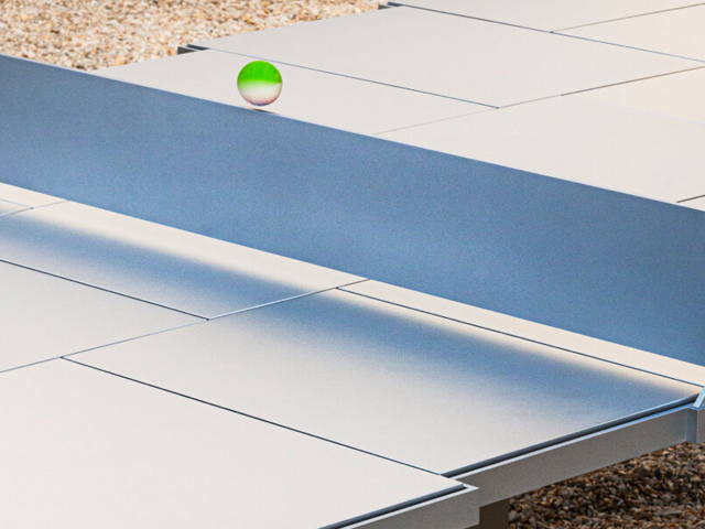 The top of the ping-pong table is made from anodised aluminum to strengthen the metal, protect it from rusting and improve the sound quality by helping the plates vibrate more clearly. The body of the table is varnished, and the structure is stable enough for play but also has the look of a piece of modern furniture.