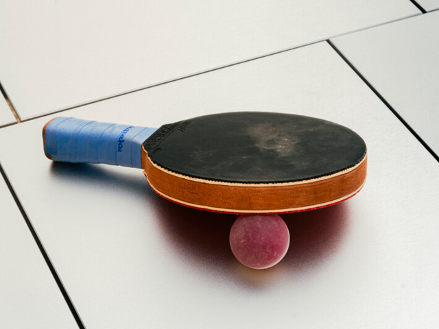 de Wulf also designed tailored rackets to work with the sound-tuned surface of his aluminum ping-pong table. The rackets are used with a rubber ball, which gives a good bounce and makes the sound vibrations clear, and for quieter use, there are also foam balls. Both types of balls change the sound performance and the way the table reacts during play. The tuning of the plates is done manually, with each of the six plates adjusted to match a specific note.
