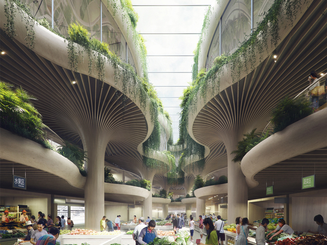 The marketplace will feature modular stalls, reminiscent of the traditional marketplaces. The design makes use of sustainable features such as natural ventilation and solar panels. The pillars that branch out to form a timber canopy are a nod to Shanghai's forests, while the biophilic design echoes the green spine unfolding within the residential masterplan. The latter features trees and shrubs native to Shanghai, creating a new park. The project is currently under construction and is due to be completed in early 2022.