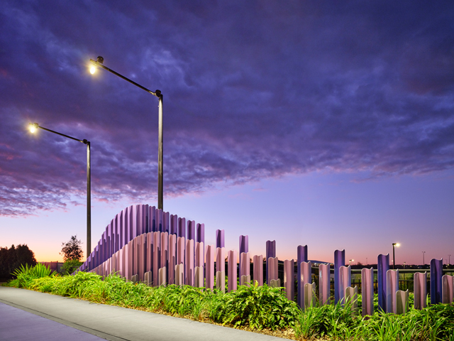 For The Brook at Aura, Street + Garden collaborated closely with Urbis and Stockland to create a striking custom entry feature that establishes a strong sense of arrival and identity. The sculptural installation comprises flowing arrangements of folded steel blades that emerge from the landscape, their dynamic forms creating visual interest from every angle.