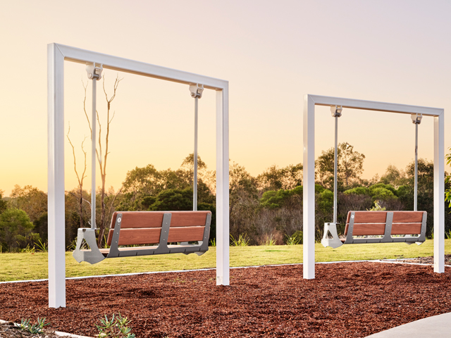 In response, Street + Garden designed the Array Swing: a backed bench suspended from a robust steel frame, allowing users to gently sway while enjoying the open parkland. Carrying the signature motifs of the Array Suite, the swing introduces a playful and relaxing feature while maintaining consistency with the broader furniture family. Installed alongside backed benches, backless benches, and tables, the collection brings a refined yet welcoming presence to the park.