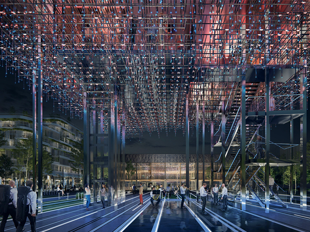 "Public space emerges between the structure’s supporting poles where various interactions and uses emerge, creating an active space underneath the project,” stated the design team. “A bar nestles up above, suspended in a ‘cloud’. Here, users can take in the structure’s shimmering patterns produced throughout the day, and enjoy a more intimate atmosphere in the evening. A panoramic restaurant emerges from the cloud in a warm, wooden atmosphere. The glazed façade can be opened completely, allowing the surrounding landscape to penetrate this space."