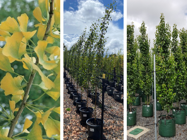Left to right: The lime-green foliage of Ginkgo ‘Lemonlime Spire’(PBR), tall and narrow Betula pendula fastigiata and ever-reliable Pyrus calleryana ‘Capital’.