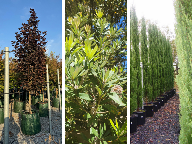 Left to right: Beautiful year-round colour of Acer ‘Crimson Sentry’, Banksia integrifolia ‘Sentinel’, Cupressus sempervirens ‘Glauca’