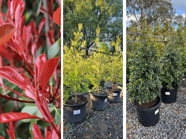 Left to right: The striking new growth of Photina ‘Thin Red’ ™, Callistemon viminalis ‘Slim’™ and Syzygium 'Straight and Narrow’™