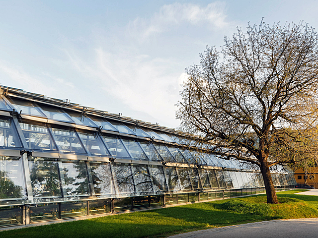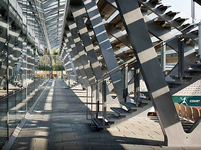 The stadium's concourse, which provides access to the stands, runs alongside the greenhouses so that spectators can see the botanical collections.