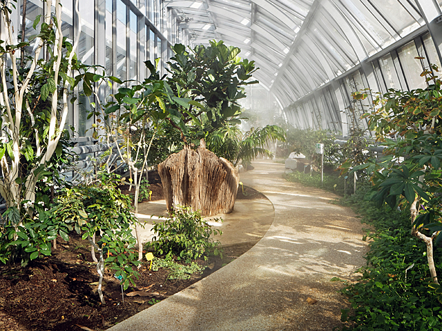 The curved steel and glass greenhouses contain flora from four regions: America, Asia, Africa and Oceania.