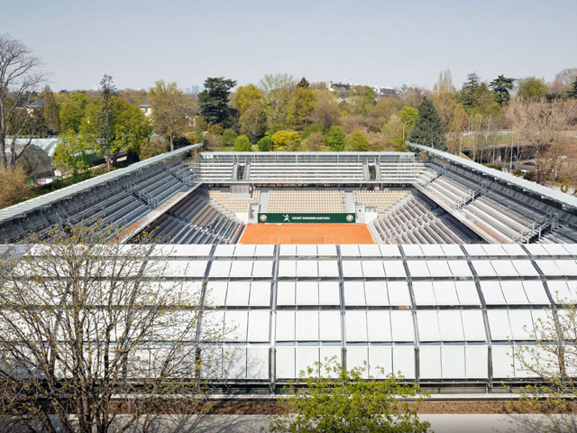 Taking the green from the court to the stadium, architect Marc Mimram designed the 2019 French Open Tennis Stadium to include botanicals greenhouses incorporated into all four stands.