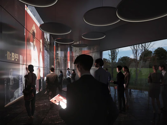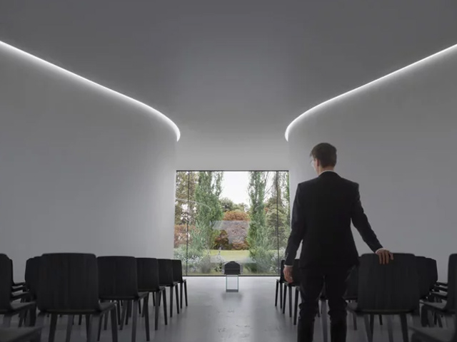 The first room is enclosed by a “memory wall”, a multimedia screen that greets guests with videos and photographs shared by family and friends, to form a lively collage celebrating their life. In the middle of the funeral centre, the space for the remembrance ceremony is shaped as a triangle, offering intimacy for both small and bigger groups. Its two curved walls and the ceiling bend inwards to define a passage where the coffin is placed, while behind, an expansive empty space opens towards a panorama of the surroundings, implying a flow back towards nature and closing the circle of life.