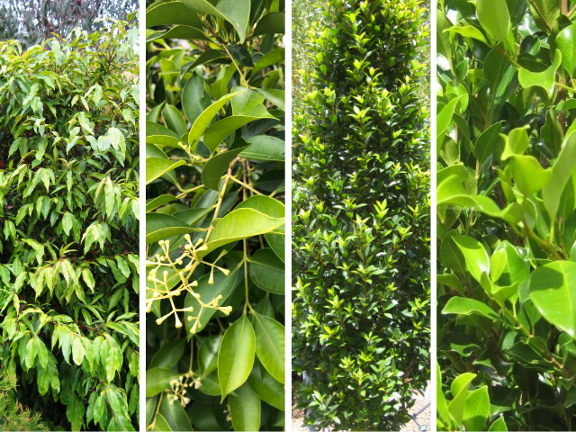 Native hedging options (from left to right): Whaterhousea floribunda ‘Whisper’, Acmena smithii ‘Sublime’, Syzygium australe ‘Hinterland Gold’ & Ficus hillii ‘Flash’