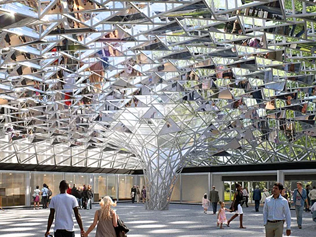 Inspired by Buffalo’s weather and the museum’s lush park surroundings, Studio Other Spaces’ design comprises a light canopy of glass and mirrors over the courtyard of the museum’s existing 1962 building.