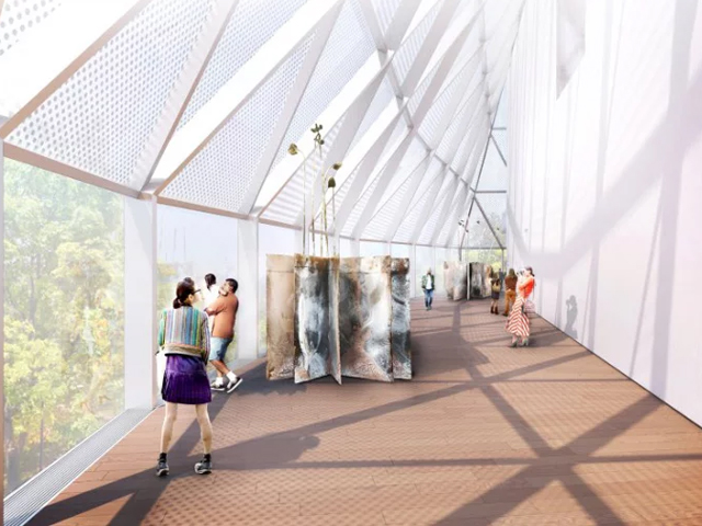 “Common sky is an instrument that uses transparent glass and mirror reflections to modulate visitors’ view into the trees of the park while generating an ever-changing shadow pattern on the ground,” added Behmann. “It forms a new public space that will host shared experiences of the natural environment within its sheltering embrace.”
