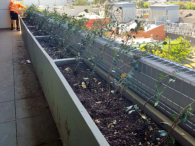 The team began with vacuuming 23 cubic metres of sandy loam out with a truck to be transported offsite. Replacement potting mix that is formulated by Bio Grow as a customised free-draining mix was then inserted into the balcony planters. Following this, boom and scissor lifts were used to transport over 450 pots that had been filled with the replacement soil to fill the now-empty planter boxes.
