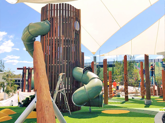 Working from a concept design by Playce Landscape Architects and the Westfield design team, The Play Works were commissioned to build custom creations to outfit the multiple play areas at the new Westfield Shopping Centre in Coomera.