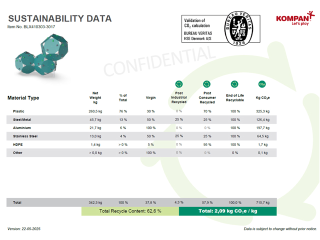 KOMPAN is proud to be leading the way in green innovation in the play and fitness industry. Every piece of equipment comes with a Sustainability Data Certificate, independently verified by Bureau Veritas, giving clients complete transparency of their environmental impact.