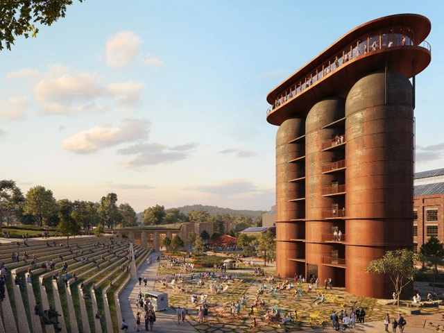 The design aims to create facilities for innovation and recreation, transforming 65 percent of the alloted site into green and blue spaces and open parklands. The vision preserves the majority of the existing building mass and historic structures, repurposing them as a restraurant on top a furnace, an industrial lift turned into an elevated garden and using existing steel in new structures.