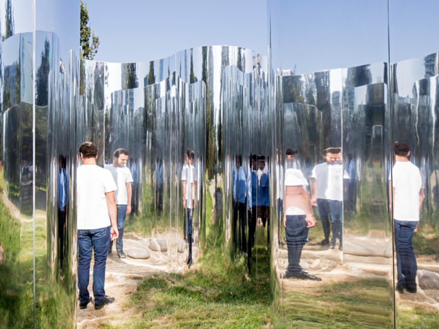 Now in place, the structure is formed of just three planes of 3.2-metre-high mirrored aluminium, which have been shaped to create concave and convex curves, both large and small. This result is an effect not dissimilar to a hall of mirrors.