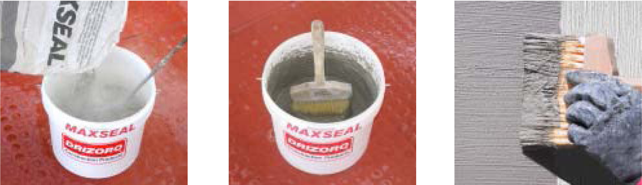 Add three parts of MAXSEAL to one part of clean water in a clean container. Mixing is best done by mechanical means only, such as a slow speed mixing drill (400-600 rpm). Small quantities may be mixed manually with a trowel. When mixing manually care must be taken to ensure product is mixed thoroughly. Mix until a thick creamy paste free of lumps is achieved (mixing time about 1 to 2 minutes). Allow the mixture to rest for 5 minutes and then remix briefly prior to application. A 25 kg bag requires approx. 7 to 8 ltrs of water approx , optimum, temperature range from 15 °C to 28 °C.