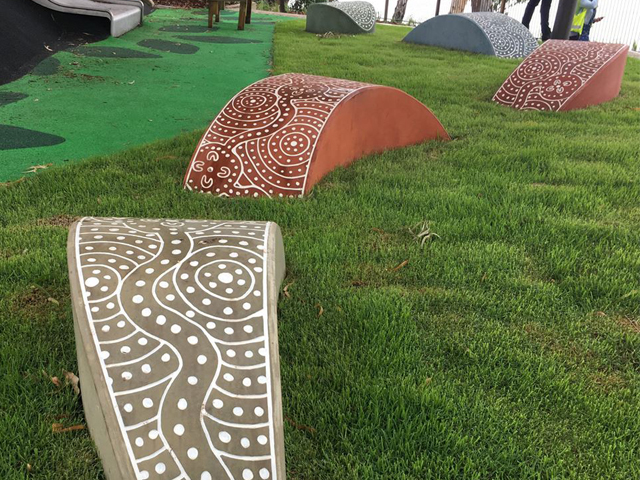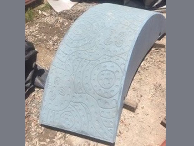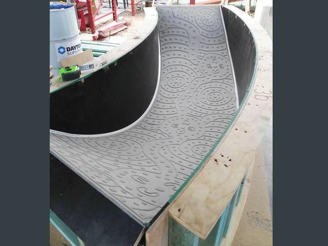 Creating the mould for the serpent was no simple matter as each part was curved in two directions. Benzini and UAP used wooden chipboard to make the basic mould and used liner of patterned lino to perfect the final shape. The lino also featured recessed Indigenous art, leaving a beautiful design in the concreted once it had been poured and set.