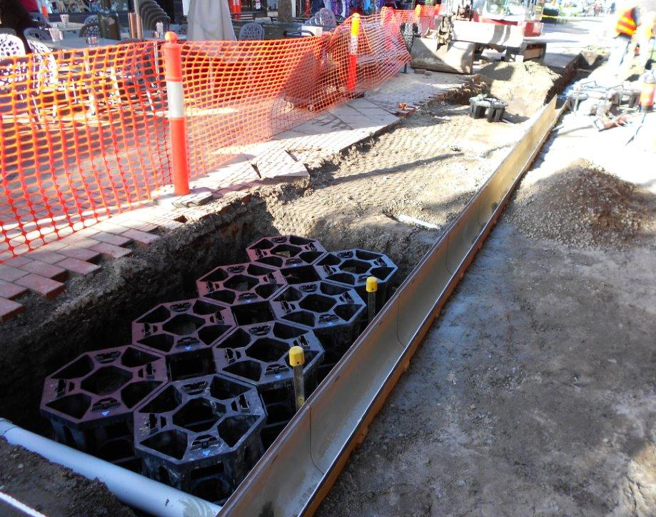 The council selected the Citygreen system for several reasons. First, they needed structural integrity, a class C loading to the streetscape paving. Second, the project needed appropriate space for root growth for advanced street trees, without compromising the pavement behaviour over time with problems such as uplifting.